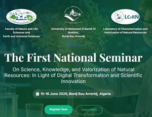 تعلن كلية علوم الطبيعة والحياة وعلوم الارض والكون عن إنعقاد ملتقى وطني موسوم بـــ : الملتقى الوطني الأول حول العلوم والمعرفة وتثمين الموارد الطبيعية: في ضوء التحول الرقمي والابتكار العلمي يومي 15-16 جوان 2026 .