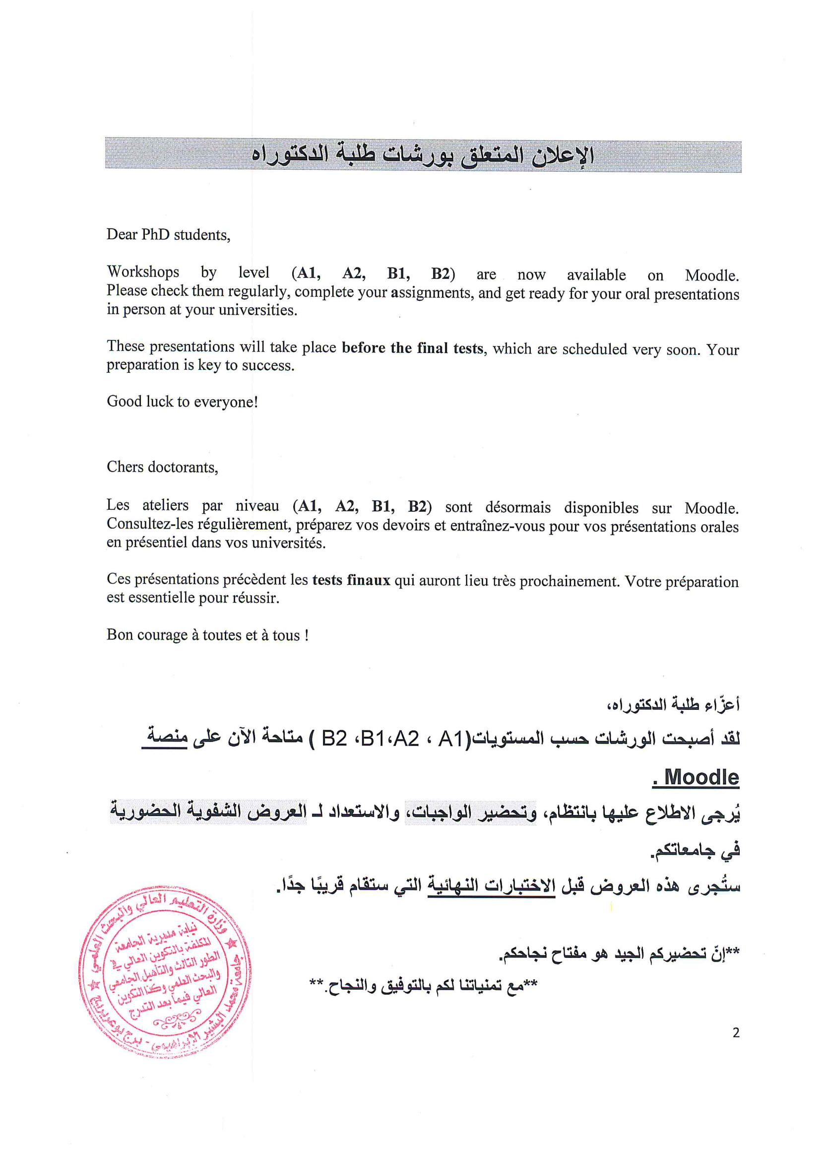 إعلان خاص بورشات طلبة الدكتوراه على منصة Moodle ، بالنسبة لمقياس اللغة الانجليزية.