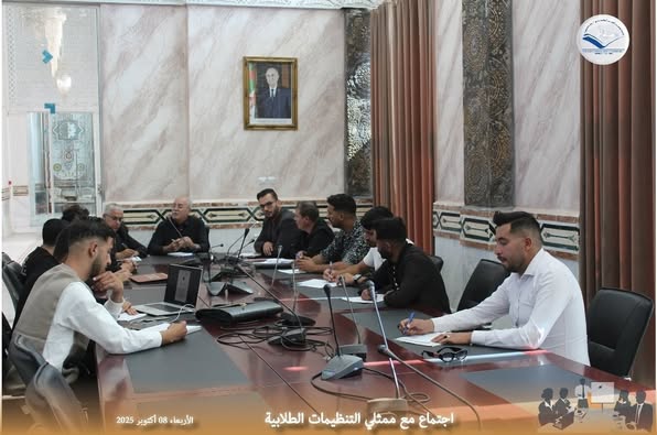عقد السيد مدير الجامعة، البروفيسور علي بوقرورة، اليوم 08 أكتوبر 2025، اجتماعا مع ممثلي التنظيمات الطلابية المعتمدة، بحضور كل من السيد نائب المدير للبيداغوجيا والسيد الأمين العام للجامعة.