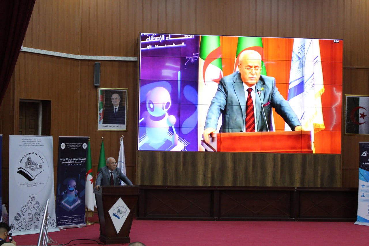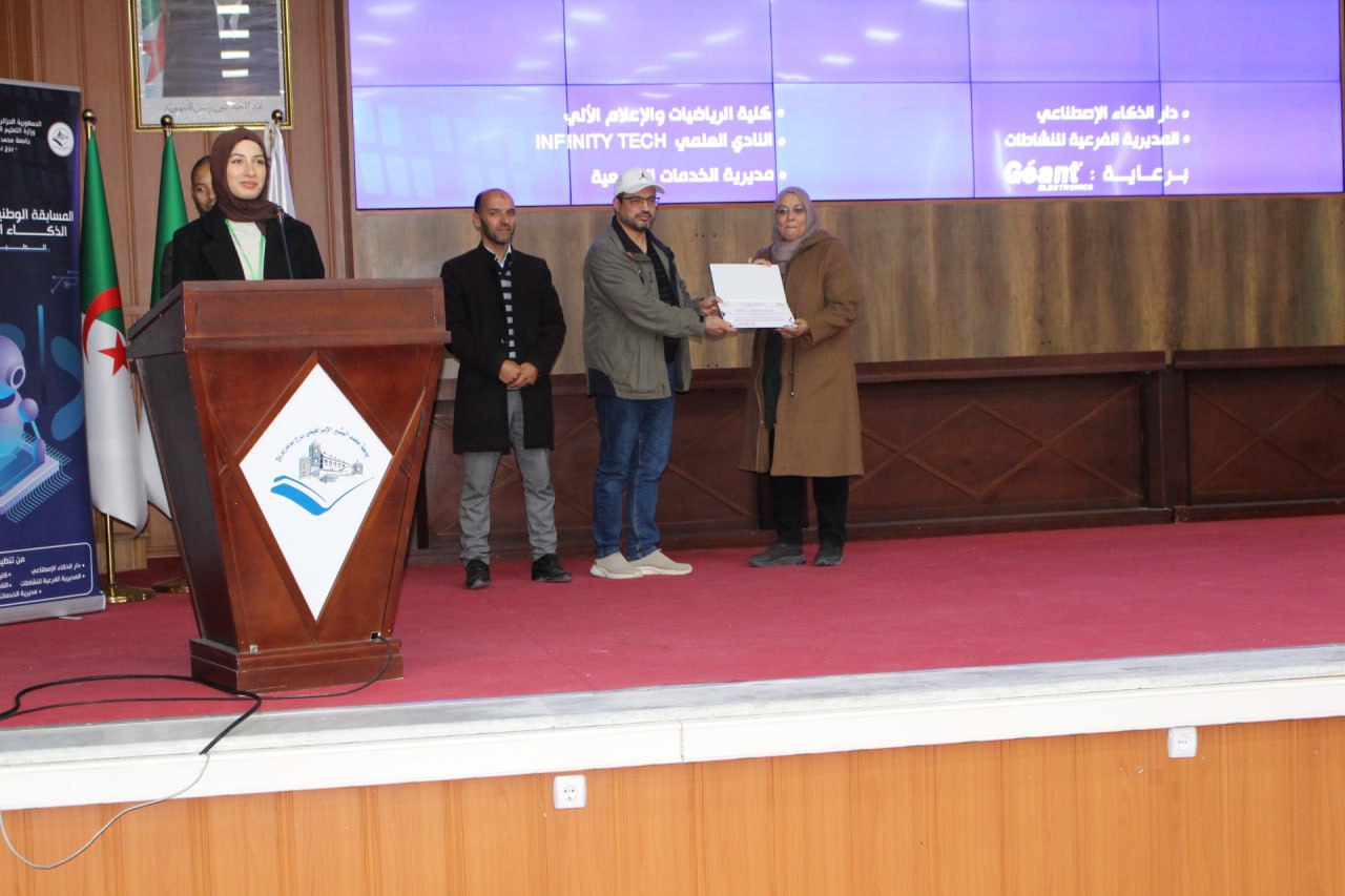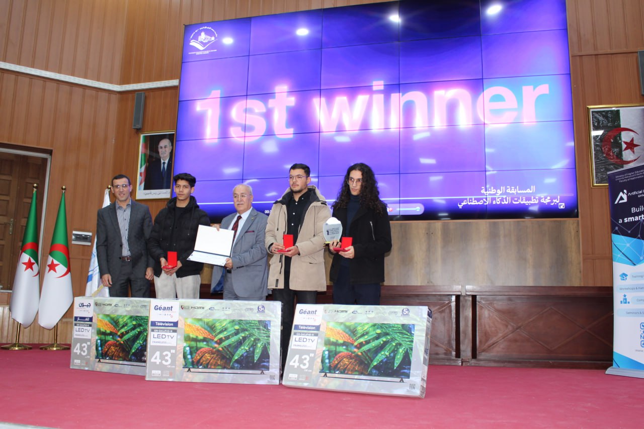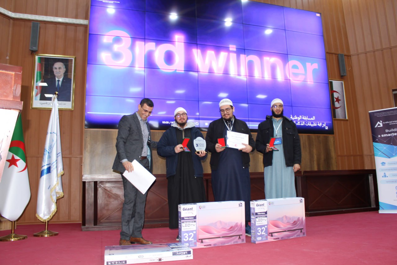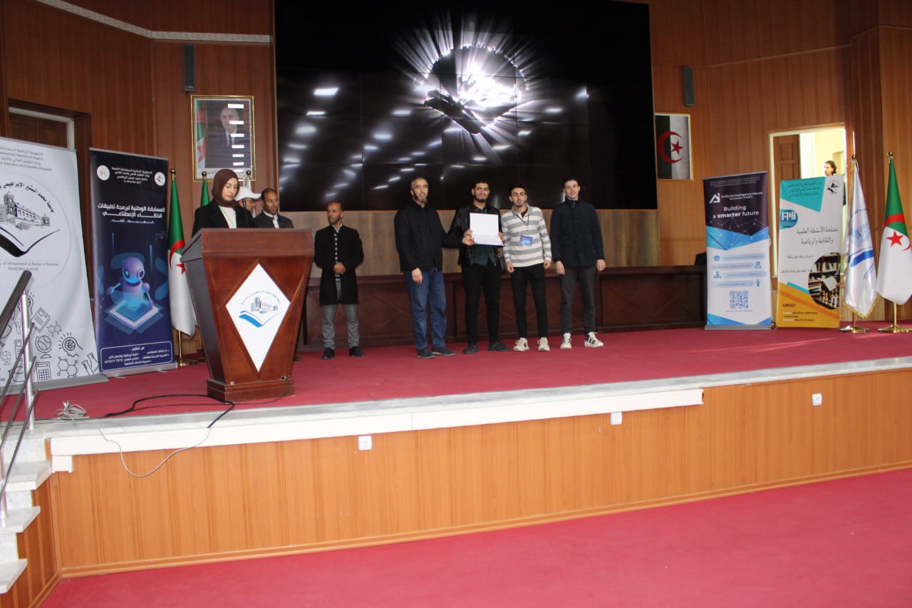 أشرف السيد مدير الجامعة البروفيسور علي بوقرورة على فعاليات اختتام المسابقة الوطنية لبرمجة تطبيقات الذكاء الاصطناعي، حيث تم خلال حفل الاختتام الإعلان عن النتائج وتكريم الفائزين، والتي جاءت على النحو الآتي: