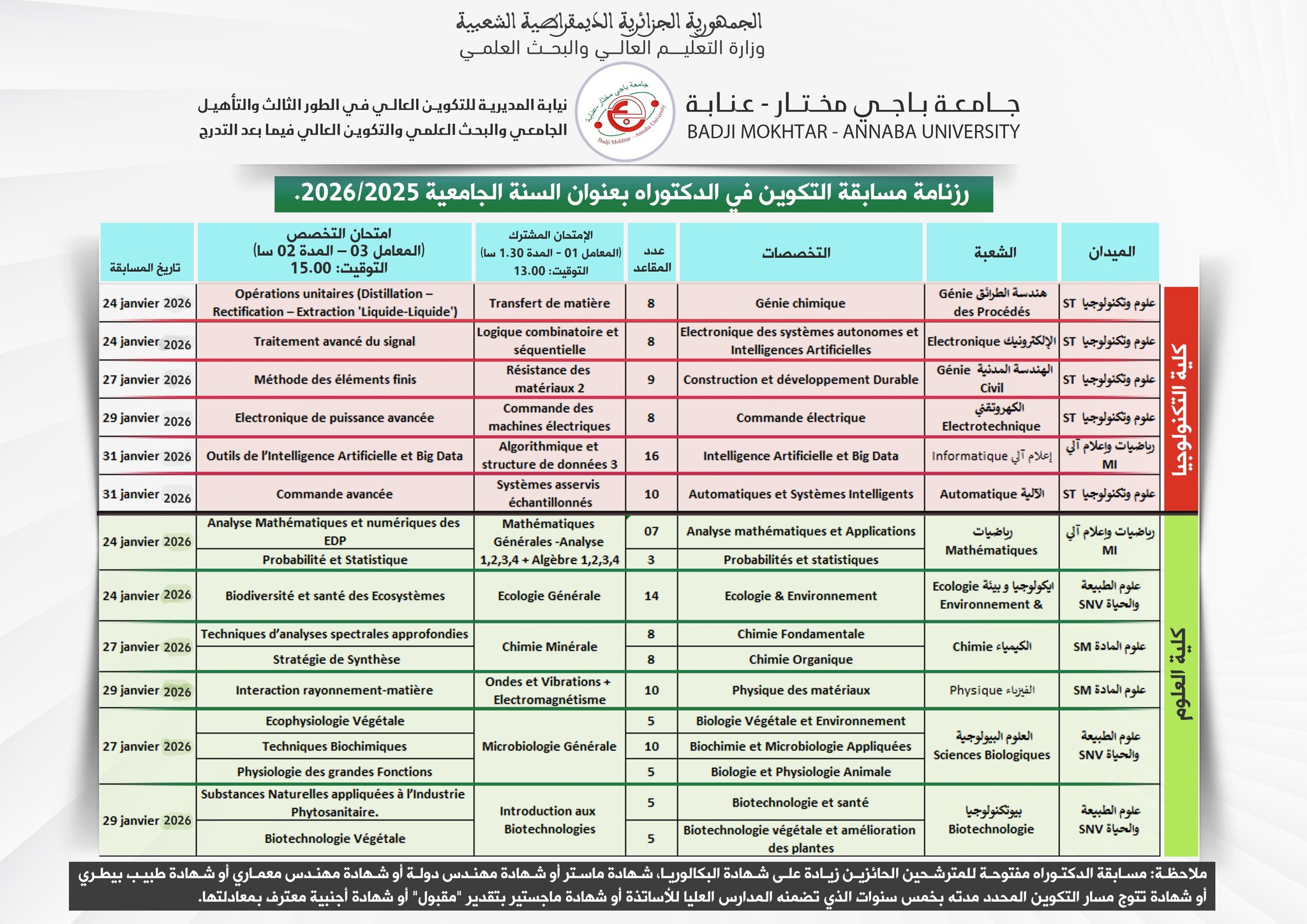 رزنامة إجراء مسابقة الالتحاق بالطور الثالث *الدكتوراه* في إطار مدارس دكتوراه وطنية في" ترقية المرئية" بعنوان السنة الجامعية 2025/2026 ، المنظمة من طرف جامعة: عنابة
