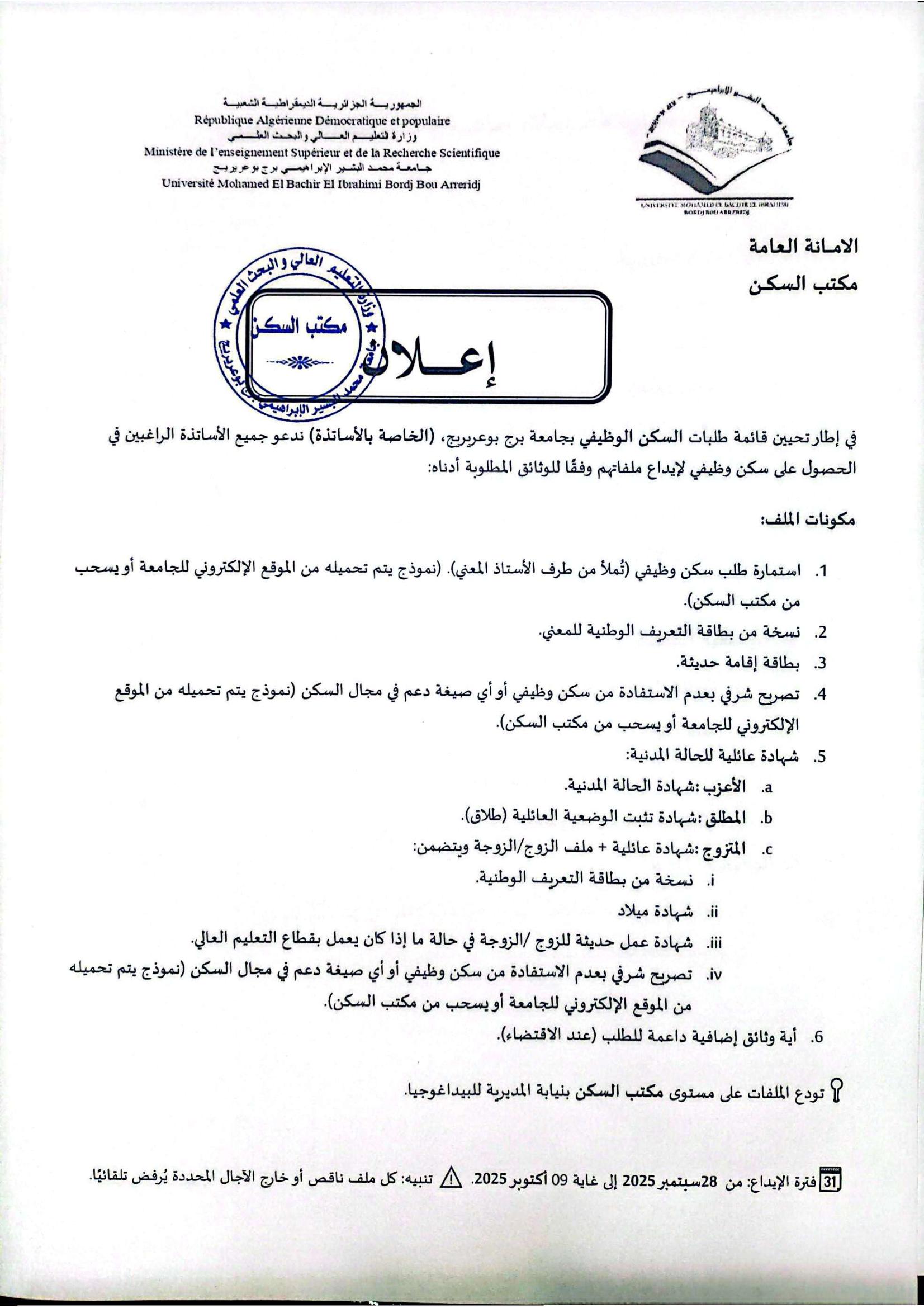 في إطار تحيين قائمة طلبات السكن الوظيفي بجامعة برج بوعريريج الخاصة بالأساتذة ندعو جميع الأساتذة الراغبين في الحصول على سكن وظيفي لإيداع ملفاتهم وفقًا للوثائق المطلوبة أدناه: