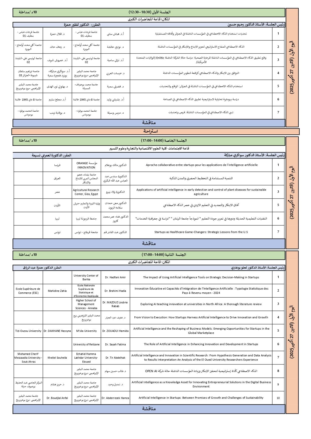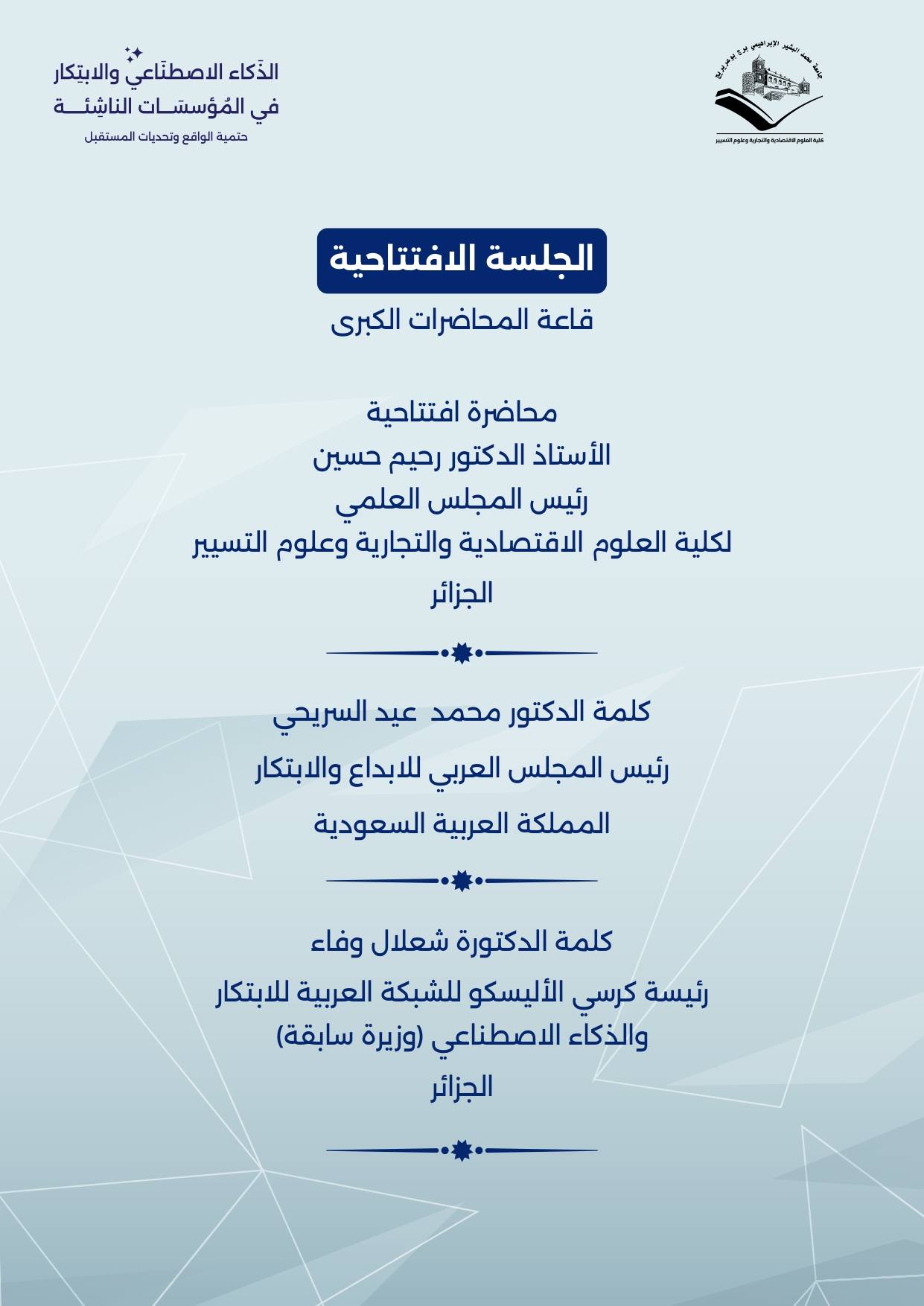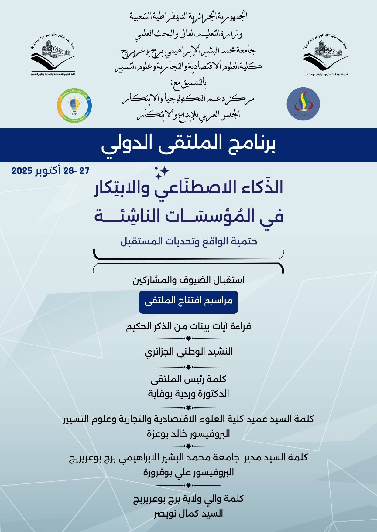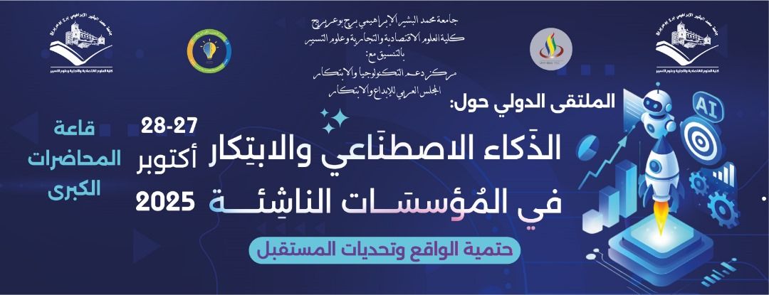 الملتقى الدولي الحضوري الموسوم" الذكاء الاصطناعي والابتكار في المؤسسات الناشئة"؛ يومي 27-28 أكتوبر 2025_بقاعة المحاضرات الكبرى للجامعة.