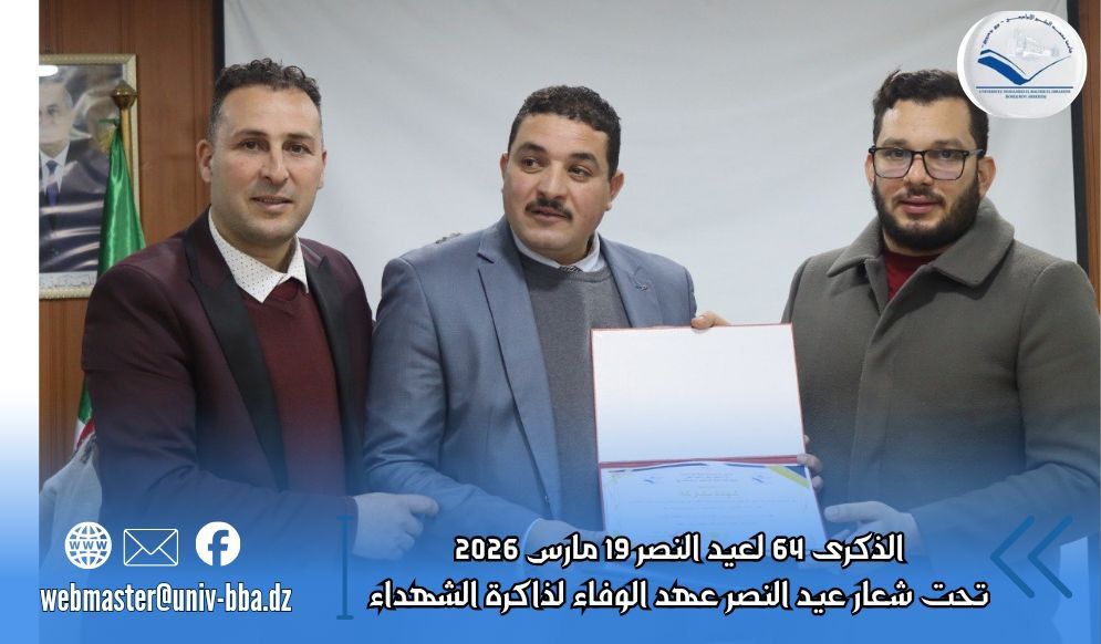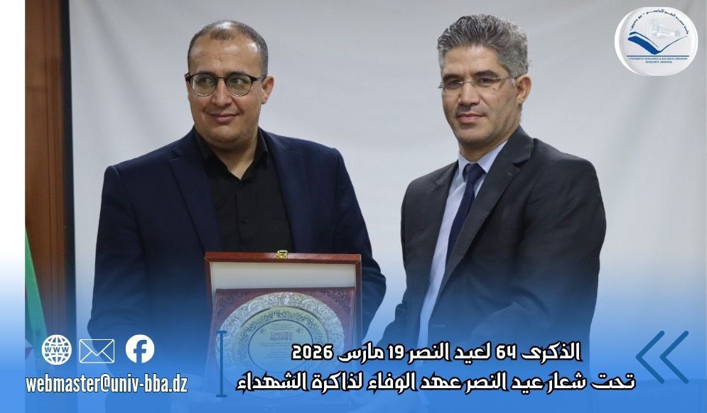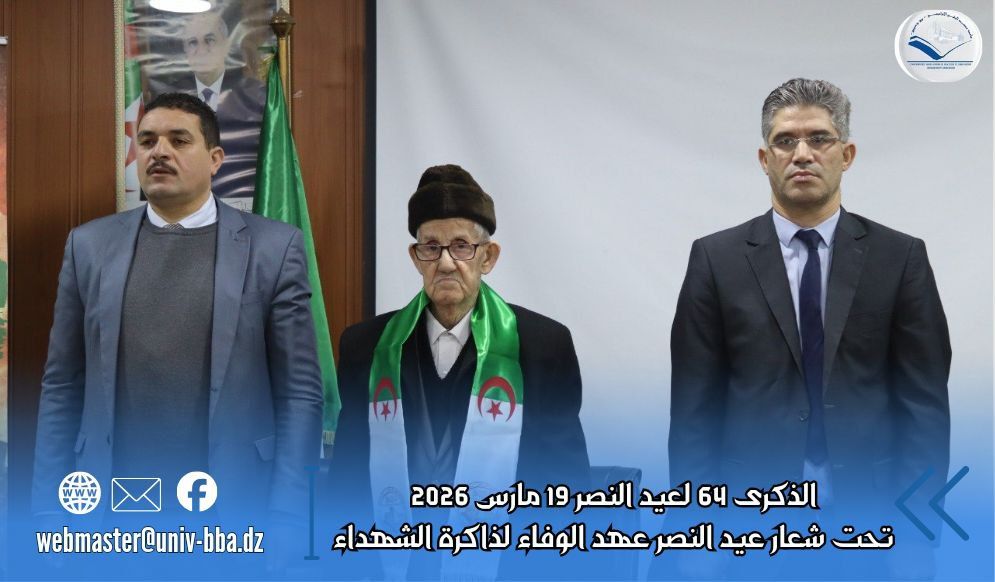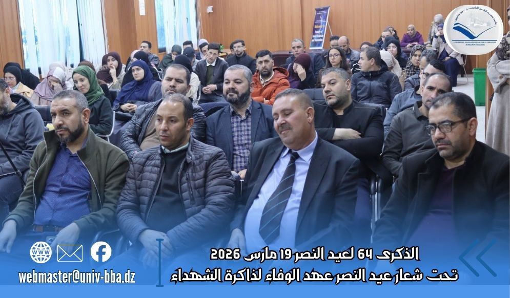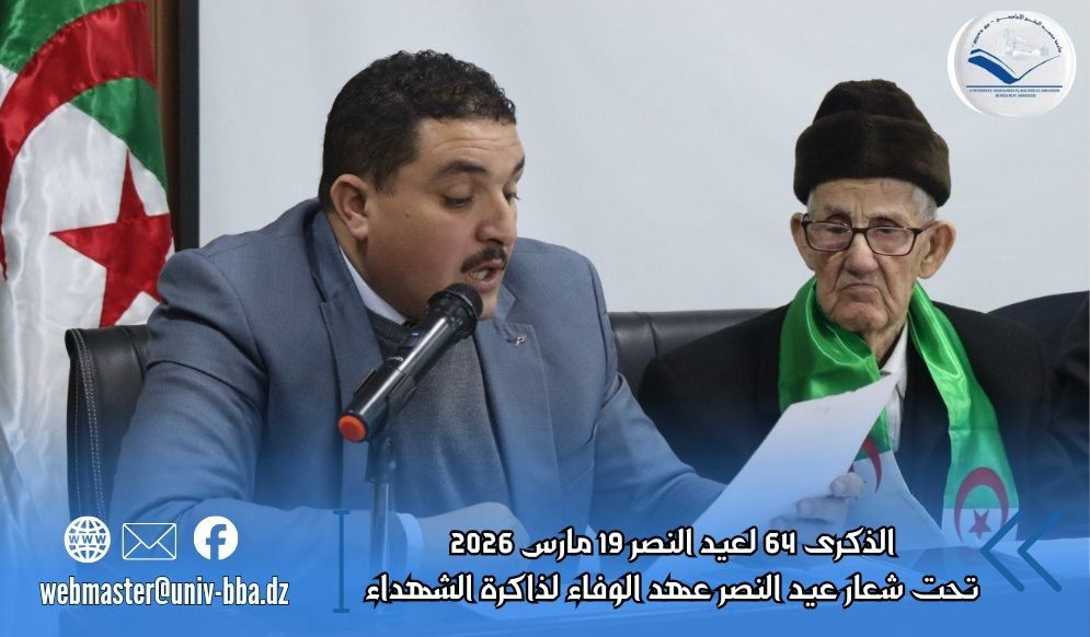 تحت إشراف السيد مدير الجامعة، البروفيسور علي بوقرورة، وفي أجواء مفعمة بروح الوطنية والاعتزاز، أحيت جامعة محمد البشير الإبراهيمي اليوم، 18 مارس 2026، الذكرى الرابعة والستين لعيد النصر المجيد، وذلك بقاعة المناقشات لكلية العلوم الانسانية والاجتماعية.